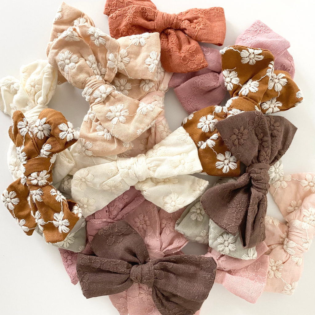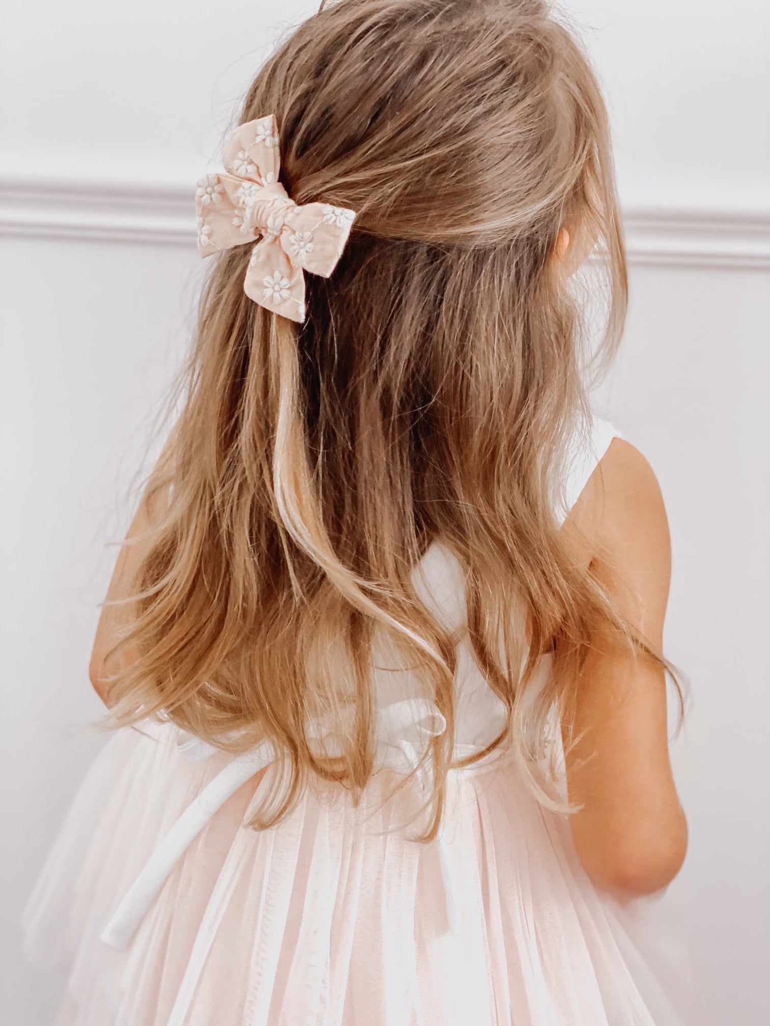 Embroidered Fabric Flower Bow - Pink + Ivory