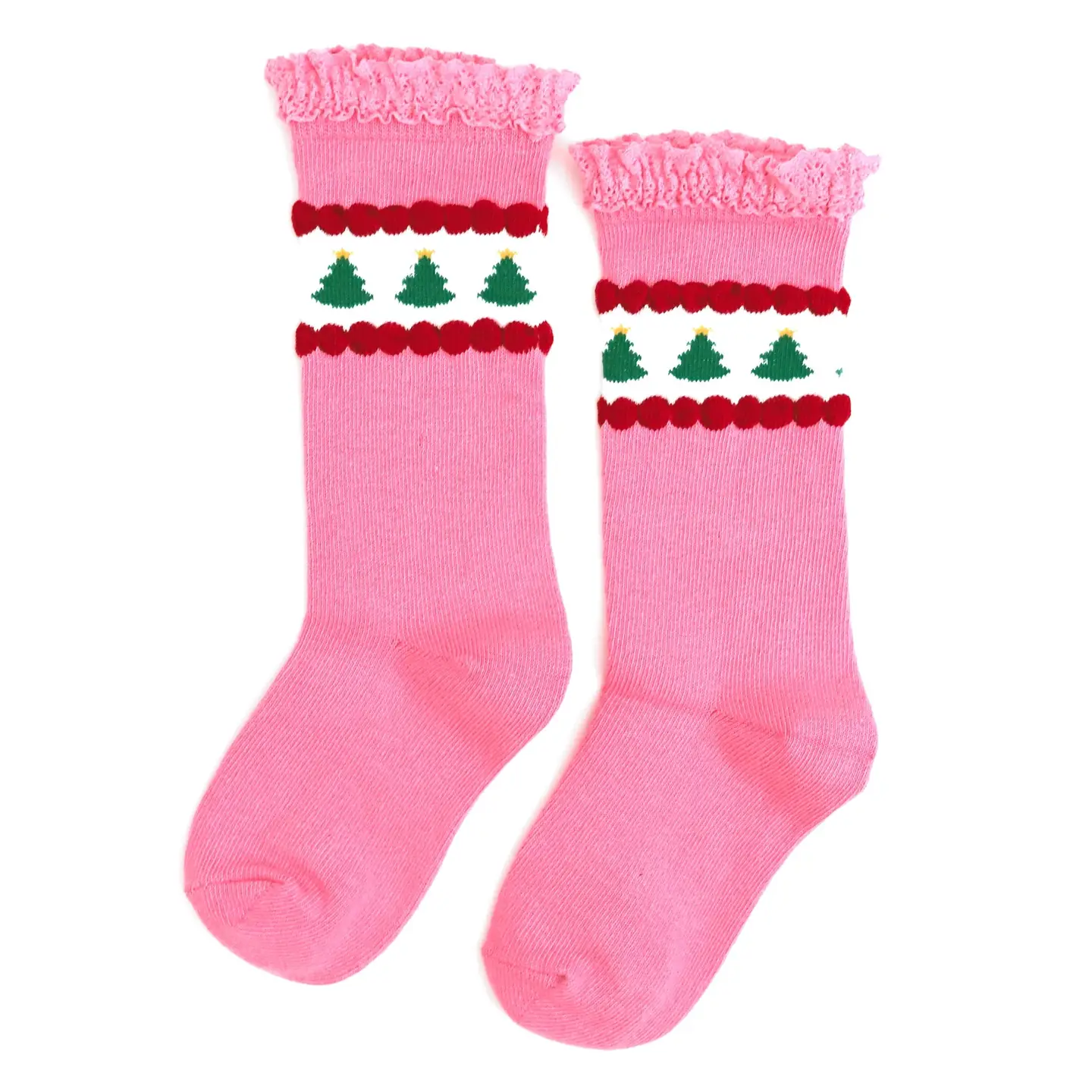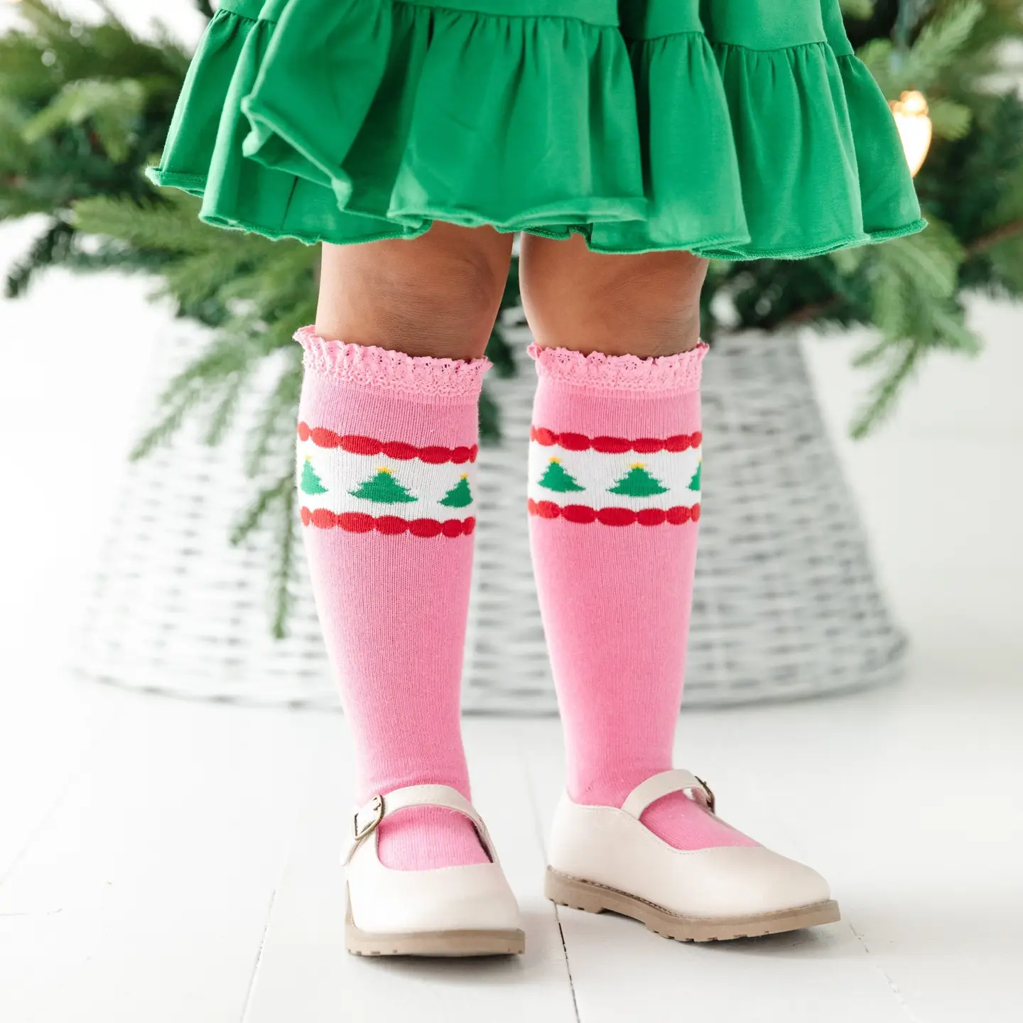 Pink Tree Lace Top Knee High Socks Our lace top knee high stockings are a fan favorite! And for good reason! Perfect for all seasons and styles- with the sweetest lace detail. We are certain they'll fit into your little one's wardrobe.