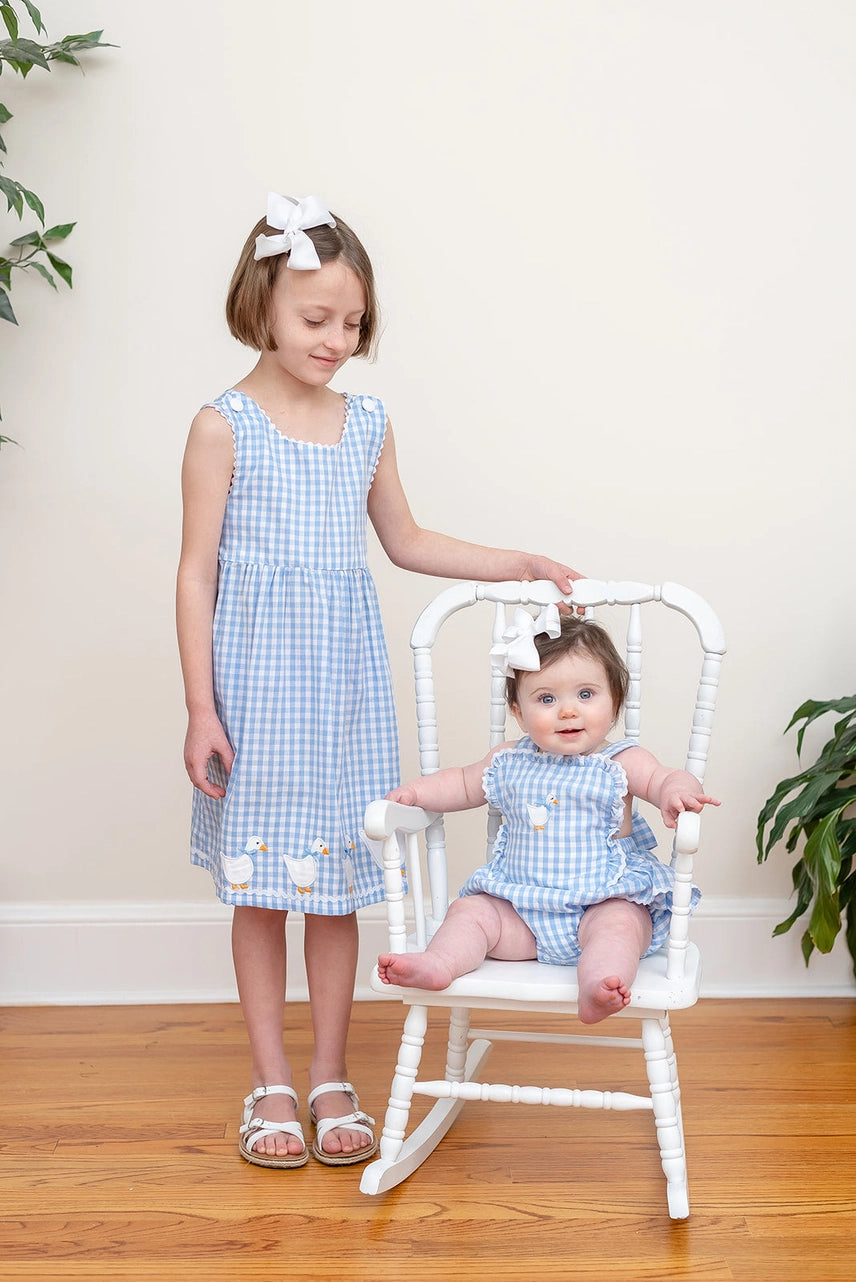 This fun and stylish Blue Gingham Goose Ruffle Bow Romper is perfect for your little one! Your darling gosling will look adorable in this ruffled romper, complete with a bow back for extra charm. Perfect for any outfit or occasion, this comfortable romper will keep your sweet girl extra cute and picture-perfect!