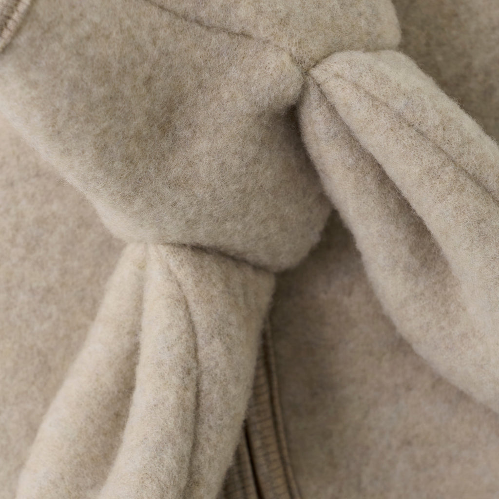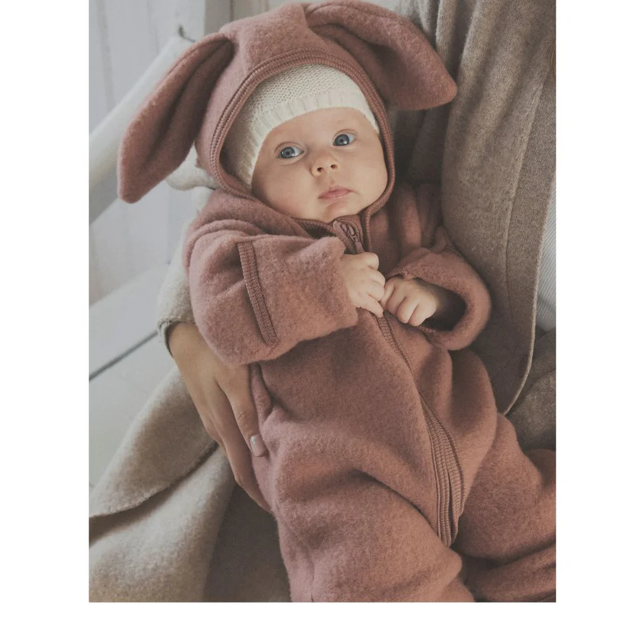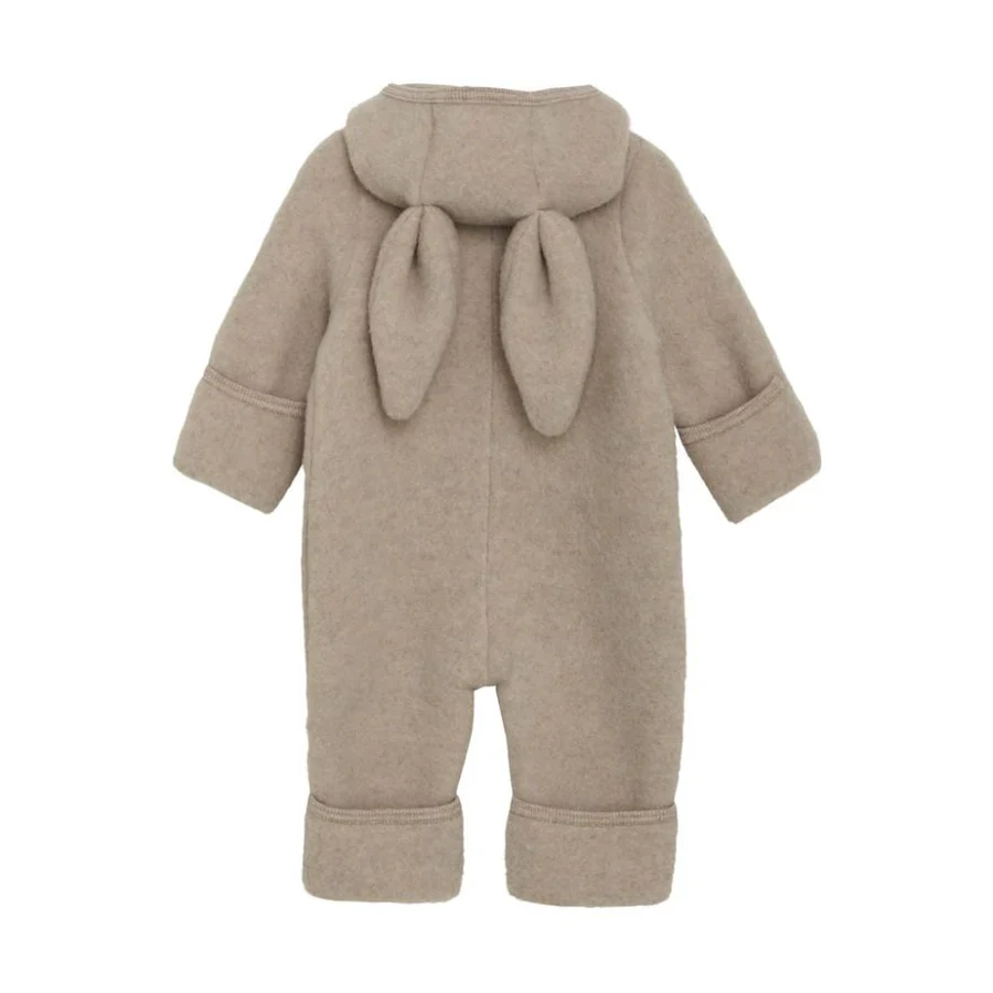 Smart and warm HUTTEliHUT pram suit in wool fleece. The HUTTEliHUT pram suit has a fixed hood with a round head shape with small cute ears. The pramsuit has long sleeves and legs with practical folds up to size 80, to keep little feet and hands warm. It has ribbed edges at all openings. It opens at the front with a hidden zipper with chin protection.