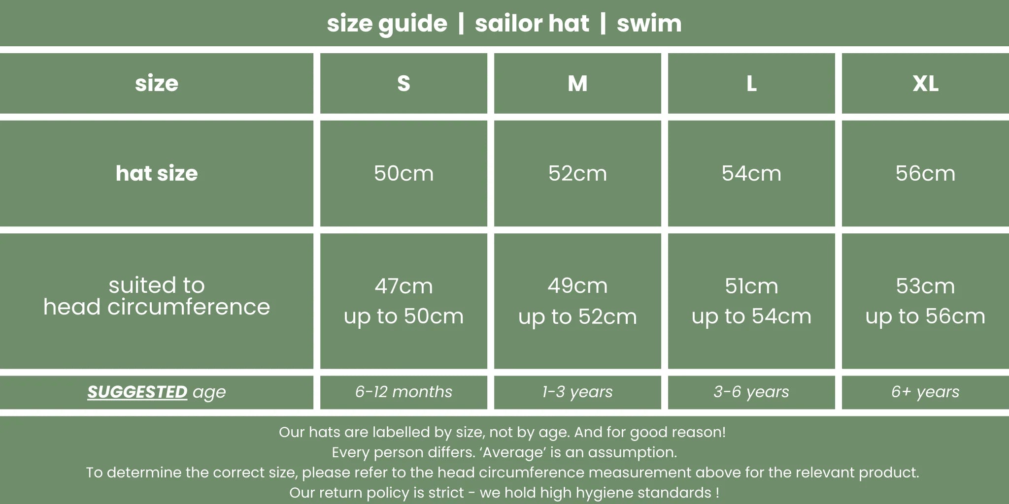 Example: a 52cm Sailor Hat is suggested for a Head Circumference starting from 49cm (loose fit) and will be able to be continued to be worn up until the Head Circumference reaches approx. 52cm maximum.