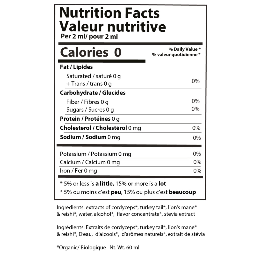 Extracts of Cordyceps*, Turkey Tail*, Lion’s Mane* & Reishi Mushrooms*, Water, Extraction Spirits*, Organic Plant-Derived Flavor Concentrates*, Stevia*.