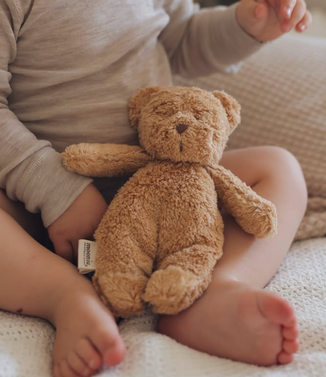 The MOONIE Sensory Little Teddy is your baby’s first soft friend designed to inspire, comfort, and support healthy development from day one. Crafted from certified organic cotton, this small teddy promotes sensory exploration, develops fine motor skills, and stimulates your child’s imagination through touch and play.